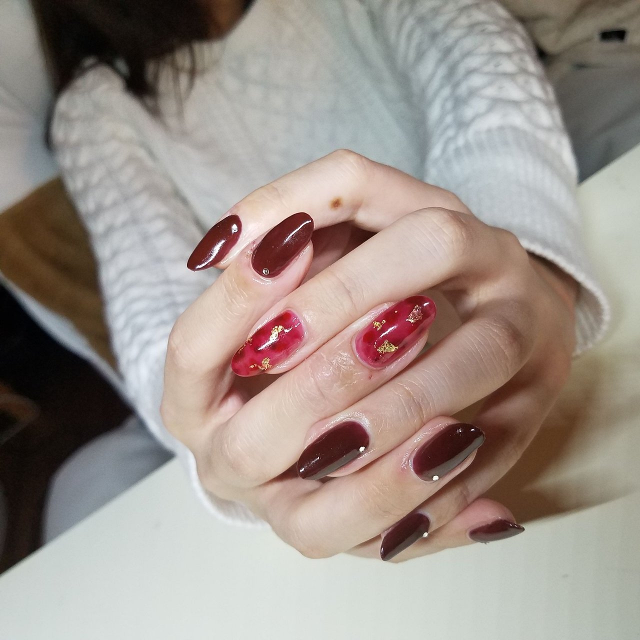 少し濃い目のブルーも、大人っぽいニュアンスカラーをセレクトすれば洗練された大人ネイルに! 赤系 @rkさんのインスタグラム 存在感のある赤系ドレスなら、鮮やかな 赤 や ボルドー のネイルを。 金箔をのせてゴージャス♡
